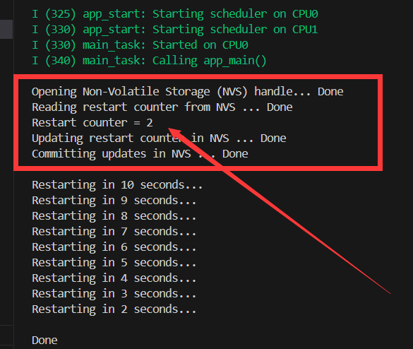 下面的案例用于在ESP32设备上实现一个简单的重启计数器,并将重启次数存储在非易失性存储中。