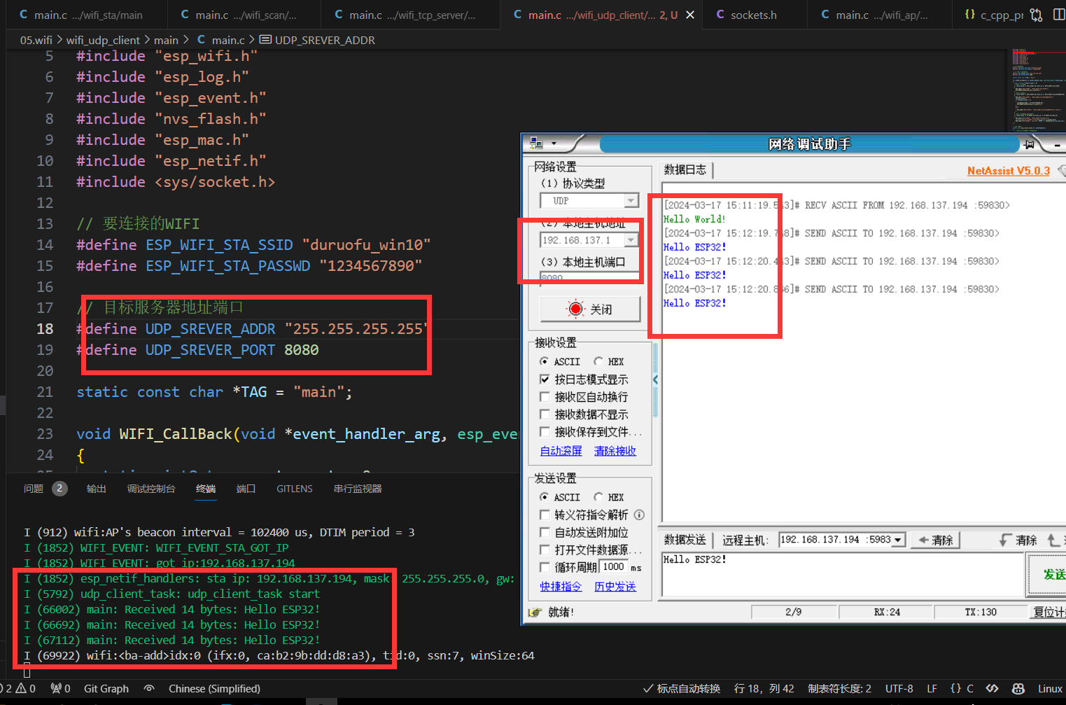 代码:https://github.com/DuRuofu/ESP32_Learning/tree/master/05.wifi/wifi_udp_client