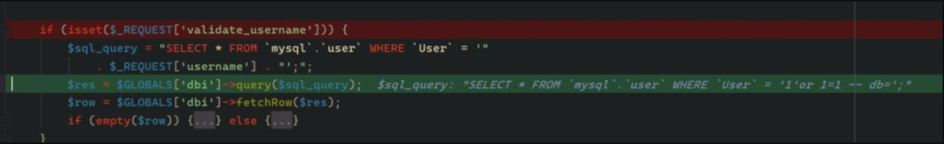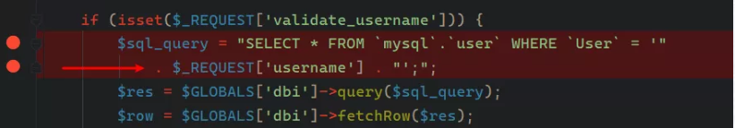 定位到文件libraries/server_privileges.lib.php,此处就是SQL注入存在点,username和validate_username都可控,我们往上回溯定位if所在的函数。
