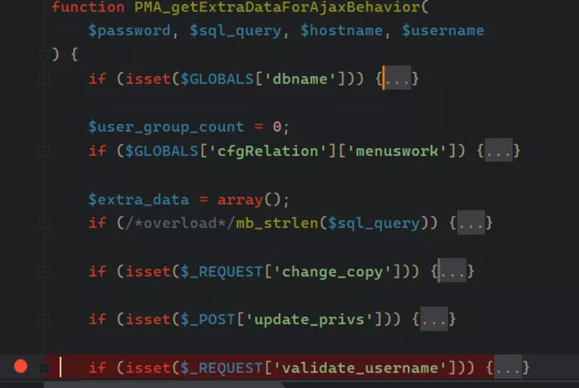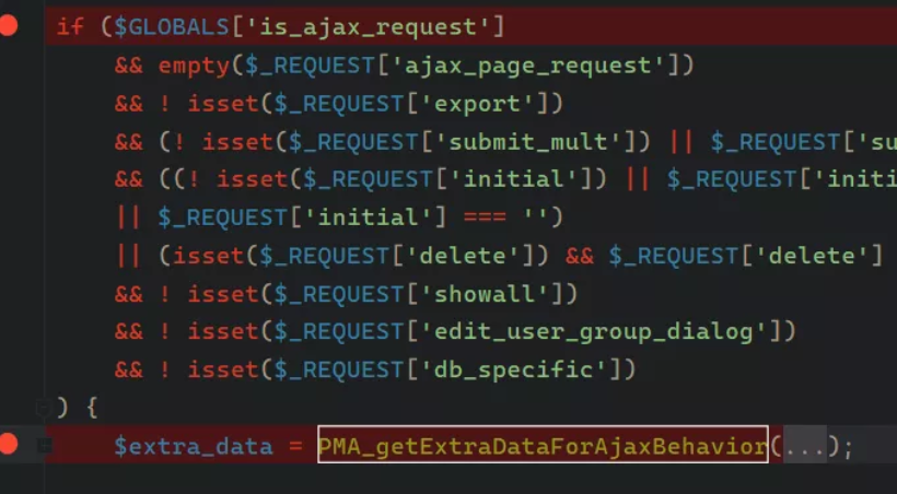 可以看到if处于PMA_getExtraDataForAjaxBehavior函数内。下一步使用phpsotorm快捷键ctrl+B定位到触发此函数的点。