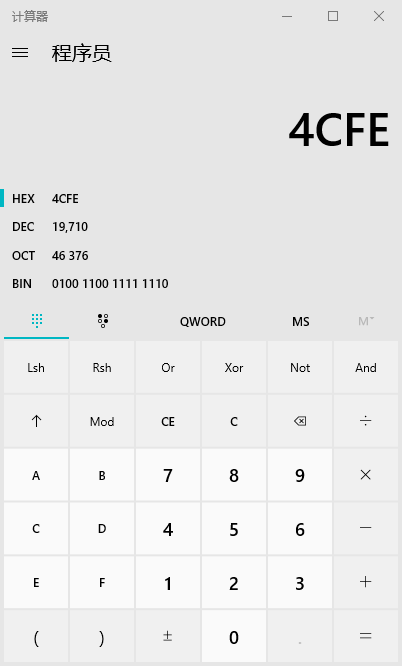 随后拿出来0x4cfe转换成10进制Windows下可以用计算器的程序员模式 选择HEX输入4cfe即可得到10进制的端口号19710