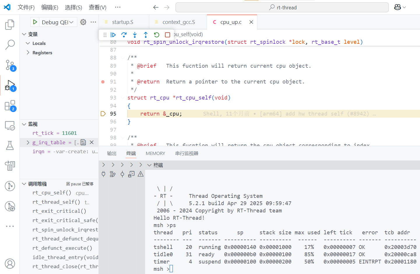 下述是使用VScode调试的展示,VScode调试需要配置脚本,脚本配置请结合qemu手册进行配置或者使用参考脚本。